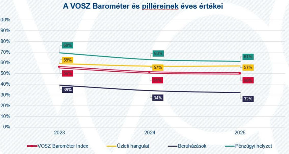 Ami a VOSZ Barométer 2025 negyedik negyedéves aktuális számait illeti, a fő mutató értéke 49 százalékra csökkent a harmadik negyedévi 50 százalékról, míg a legjobban teljesítő, a pénzügyi helyzetet tükröző alindex mutatója változatlan maradt (61 százalék). Hasonlóan stagnált az üzleti hangulatot tükröző alindex értéke is (58 százalék). A legalacsonyabb értéket mutató, a beruházási hajlandóságot mérő alindex pedig jelentősen csökkent, 28 százalékra esett vissza a harmadik negyedévi 32 százalékról.