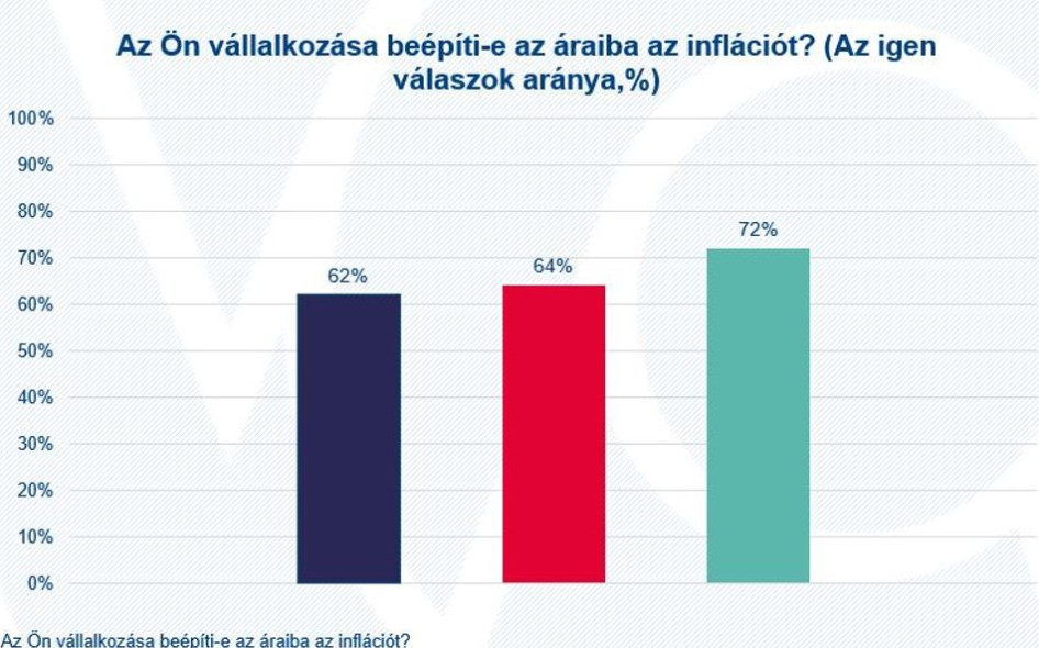 Az inflációval kapcsolatban arra hívta fel a figyelmet Kozák Ákos, hogy 2023 és 2025 között – a csökkenő drágulási ütem mellett is – érdemben (10 százalékponttal) nőtt azoknak a vállalkozóknak az aránya, amelyek az inflációt tudatosan beépítik áraikba, ami a nagy inflációs sokk tartós hatását jelzi a vállalati döntéshozatalban. Az árképzés így nem átmeneti reakció, hanem beépült alkalmazkodási mechanizmus lett.