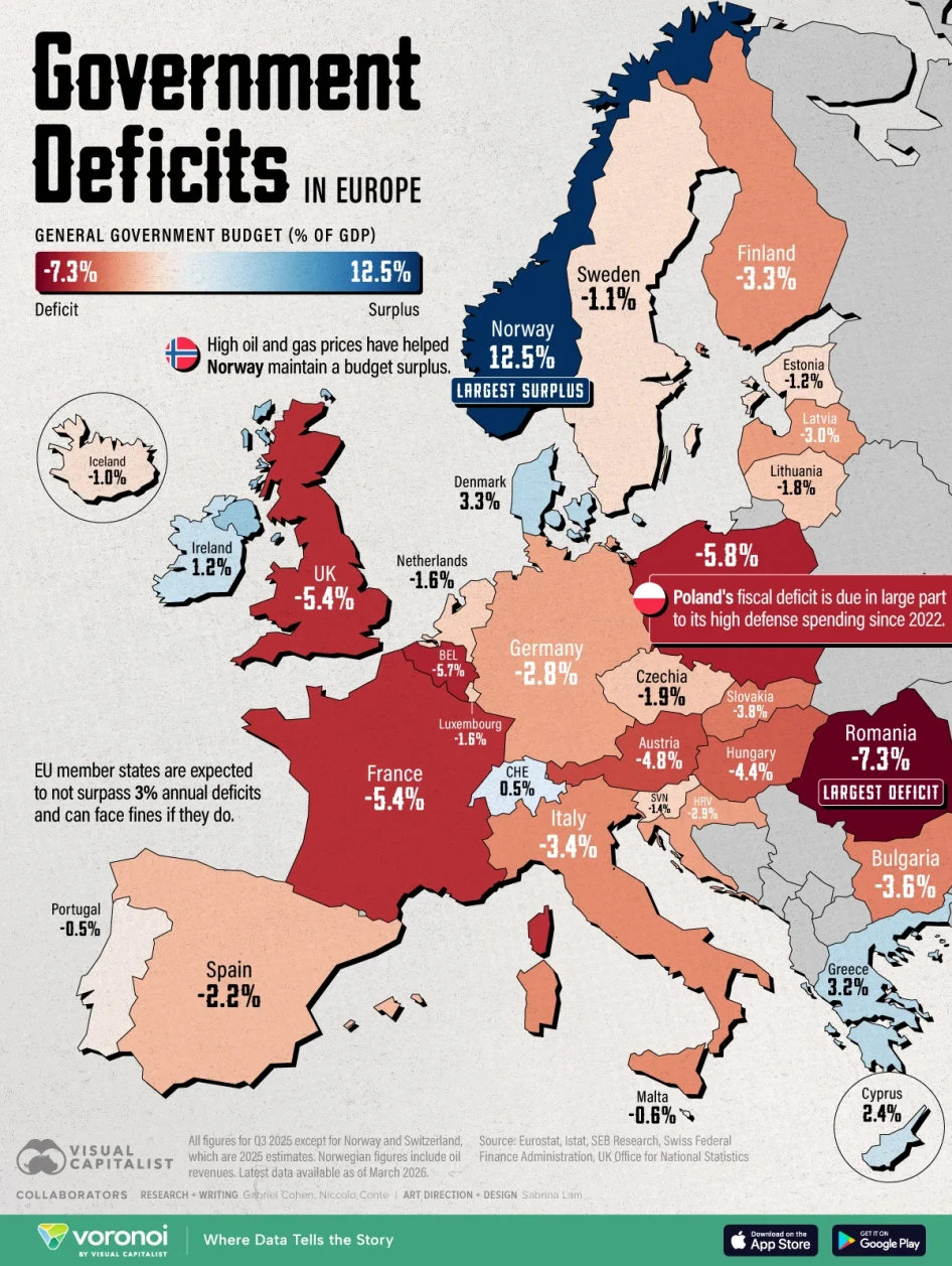 Norvégia 12,5 százalékos többlete éles ellentétben áll Európa többi részével. Az olajbevételeknek köszönhetően ez rávilágít arra, hogy a természeti erőforrásokhoz való hozzáférés hogyan alakíthatja át drámaian egy ország költségvetési helyzetét. Ezen energiabevétel nélkül azonban Norvégia jelentős hiányt mutatna, ami rávilágít helyzetének rendhagyó jellegére.