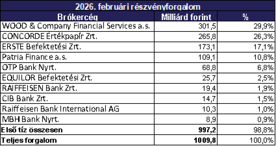 Az év legrövidebb hónapjában közel azonos szinten teljesített a hazai részvénypiac fő mutatója, a BUX a januári záróértékéhez viszonyítva: február végére 126 534,75 ponton zárt az index, ami 1,8 százalékos elmozdulást jelent. A februári összforgalom 504,9 milliárd forintot tett ki, amely 25,2 milliárd forint értékű napi átlagnak felelt meg.