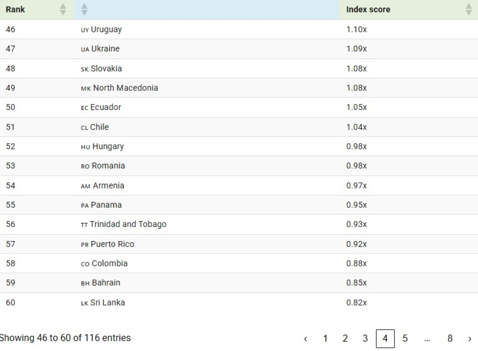Mivel az index a munkaerő méretéhez viszonyítva méri a használatot, a kisebb, technológiavezérelt gazdaságok akkor is előkelő helyen szerepelhetnek, ha teljes felhasználói bázisuk kisebb.