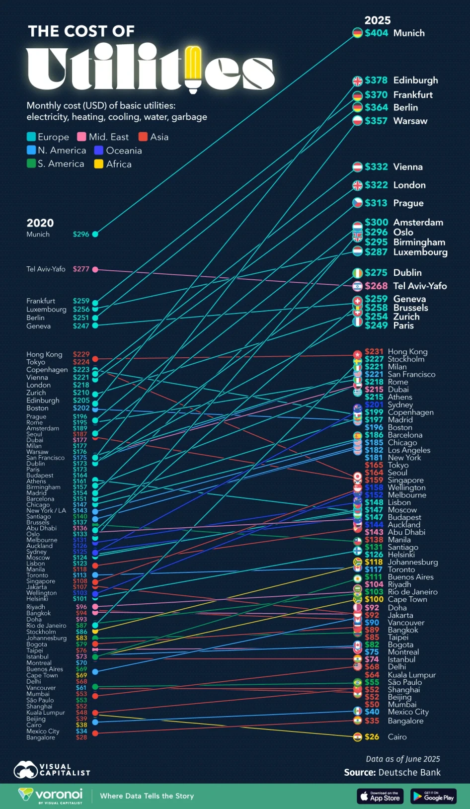 A németországi Münchenben a háztartások átlagosan havi 404 dollárt fizetnek közművekért, ami közel 40 százalékos növekedést jelent 2020 óta. San Franciscóban a legmagasabbak a közművek költségei Amerikában, ahol az árak egyötödével magasabbak, mint New Yorkban.