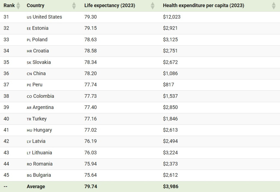 A listán szereplő országok átlagosan 79,74 év várható élettartammal rendelkeznek, ami fejenként 3986 dolláros költséget jelent, míg az Egyesült Államokban a várható élettartam 79,3 év, és fejenként 12 023 dollárt költenek erre. A hasonló országok (Kanada, Egyesült Királyság, Németország, Japán, Franciaország, Olaszország) átlagosan az Egyesült Államok egészségügyi kiadásainak körülbelül a felét költik fejenként, de mindegyikük jobb várható élettartammal rendelkezik. Magyarország az átlag alatt mind a várható élettartamot tekintve, mind az egészségügyi költést.