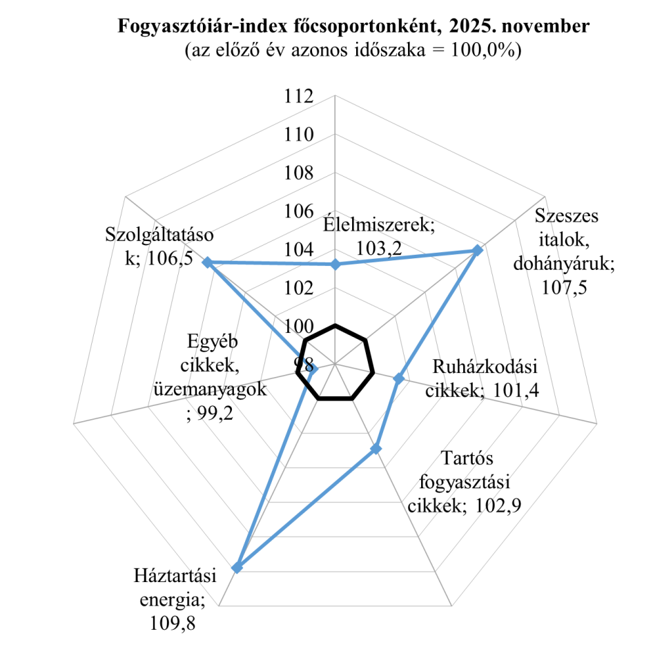 Az élelmiszerek ára 3,2 százalékkal nőtt (a vendéglátási szolgáltatások nélkül számítva 0,6 százalékkal), ezen belül az édesipari lisztesárué 15,9, a kávéé 14,9, a büféáruké 11,3, a tojásé 11,2, a csokoládé, kakaóé 10,7, az étolajé 10,1, az iskolai étkezésé 7,5, a péksüteményeké 6,7, az alkoholmentes üdítőitaloké 4,9 százalékkal. A termékcsoporton belül a margarin ára 28,3, a liszté 15,3, a tejtermékeké 11,4, a tejé 8,1, a sertéshúsé 7,8, a párizsi, kolbászé 7,0, a cukoré 4,7 százalékkal mérséklődött. A háztartási energiáért 9,8 százalékkal többet kellett fizetni átlagosan, ezen belül a vezetékes gáz 22,0, az elektromos energia 2,1 százalékkal drágult. A szeszes italok, dohányáruk ára 7,5 százalékkal emelkedett, ezen belül a dohányáruké 9,0 százalékkal. A szolgáltatások 6,5 százalékkal drágultak, ezen belül az üdülési szolgáltatások 12,2, a járműjavítás és -karbantartás 10,0, a testápolási szolgáltatások 9,3, a lakásjavítás és -karbantartás 9,2, az egészségügyi szolgáltatások 8,6, a lakbér 8,0, a sport, múzeumi belépők 7,9 százalékkal. A tartós fogyasztási cikkek ára 2,9 százalékkal emelkedett, ezen belül az ékszerek 21,5, a szobabútorok 5,9, a fűtő- és főzőberendezések 3,0, az új személygépkocsik 1,7 százalékkal többe kerültek. A járműüzemanyagok ára 5,0 százalékkal mérséklődött, a gyógyszer, gyógyáruk 5,1 százalékkal drágultak.