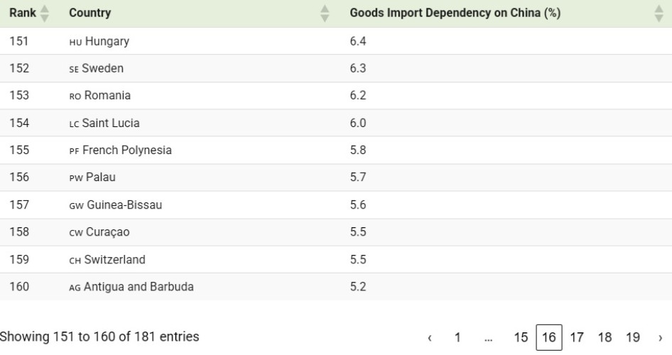 Eközben az Egyesült Államok összesítésben a 97. helyen áll, importjának 13,8 százaléka Kínából származik. Magyarország a 151. helyen áll a 181 államot tartalmazó listán.