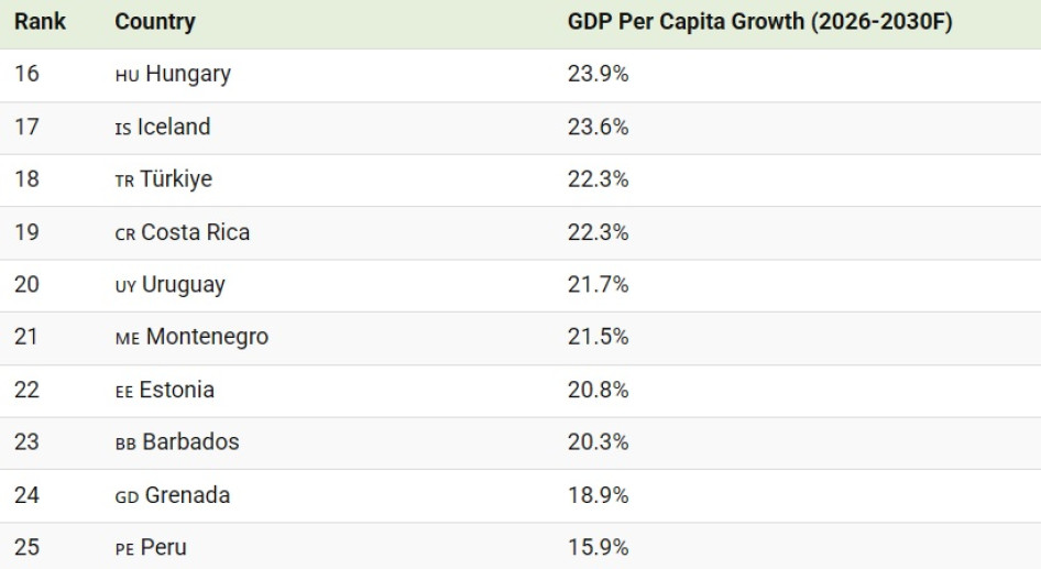 Az egy főre jutó GDP tekintetében a leggyorsabban növekvő országok között sok a feltörekvő gazdaság. Moldova vezeti a rangsort, a 2026 és 2030 közötti időszakra előre jelzett 53 százalékos emelkedéssel.