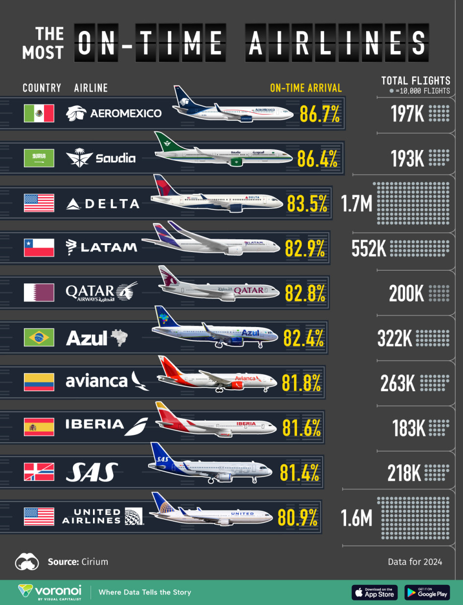 A lista élén az Aeroméxico áll a legmagasabb, 86,7 százalékos időben érkezési aránnyal, szorosan mögötte Szaúd-Arábia zászlóshajója, a Saudia 86,4 százalékkal.