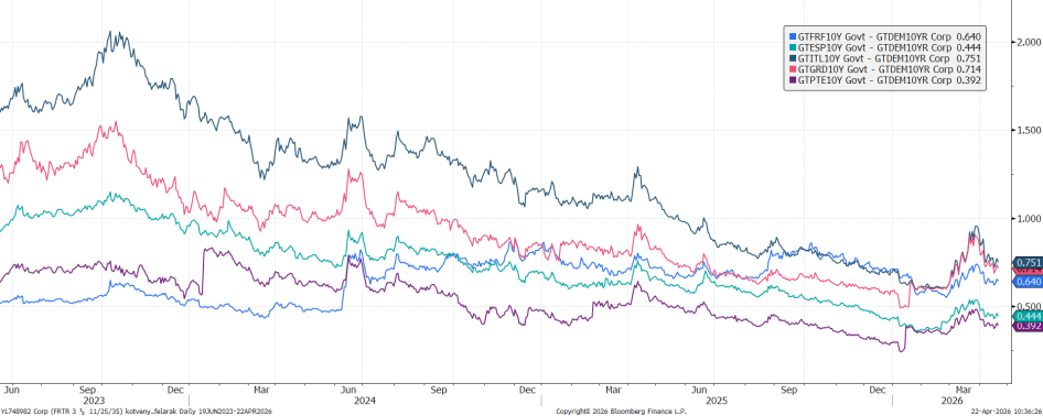 Mint a grafikonon is látszik, jelenleg az európai 10 éves hozamfelárak alapvetően 40 és 75 bázispont között mozognak (francia 64, spanyol 44, olasz 75, görög 71, portugál 39), s ami az ábráról lemaradt, például a szlovák és a horvát rendre 71 és 25 bázispont.