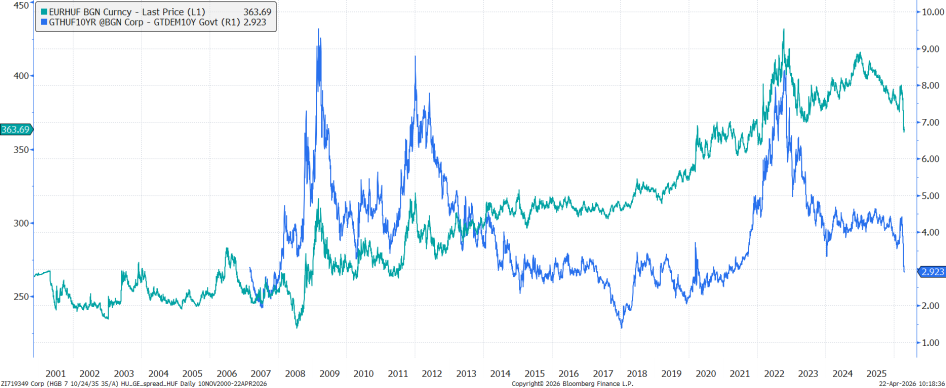 Az EURHUF árfolyam és a magyar 10 éves állampapír hozamfelára a német fölött