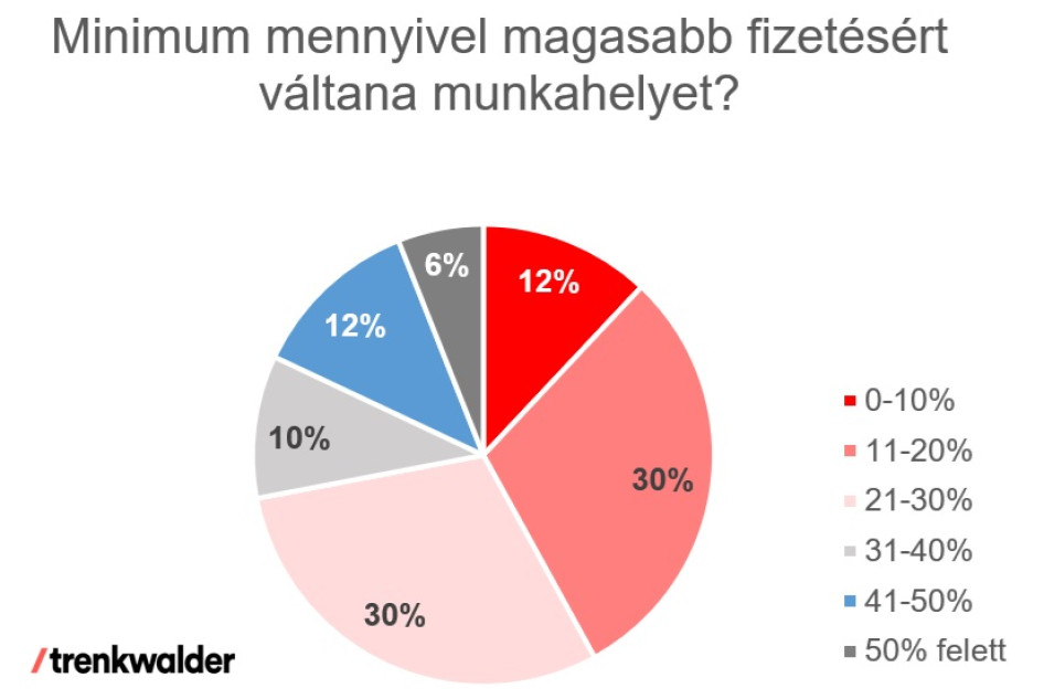 Ebben a helyzetben sokan érzik úgy, hogy anyagi problémájukat egy munkahelyváltás tudná megoldani. Jelenleg a válaszadók 48 százaléka nyilatkozik úgy, hogy ha talál megfelelő alternatívát, egy éven belül is szívesen vált munkahelyet. 12 százaléknyian már 10 százalékkal magasabb fizetésért is váltanának, 30 százalékkal kedvezőbb ajánlatra pedig az összes válaszadó 72 százaléka mondana igent.