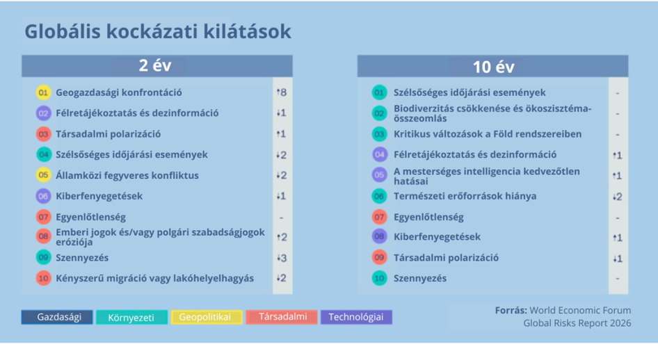 A válaszadók a geoökonómiai konfrontációt, az állami fegyveres konfliktusokat, a szélsőséges időjárási eseményeket, a társadalmi polarizációt, valamint a félrevezető és hamis információkat jelölték meg 2026-ban az öt legfontosabb közvetlen kockázatként. Kétéves előrejelzésben pedig a félrevezető és hamis információk, valamint a társadalmi polarizáció a második és harmadik helyre emelkedtek.