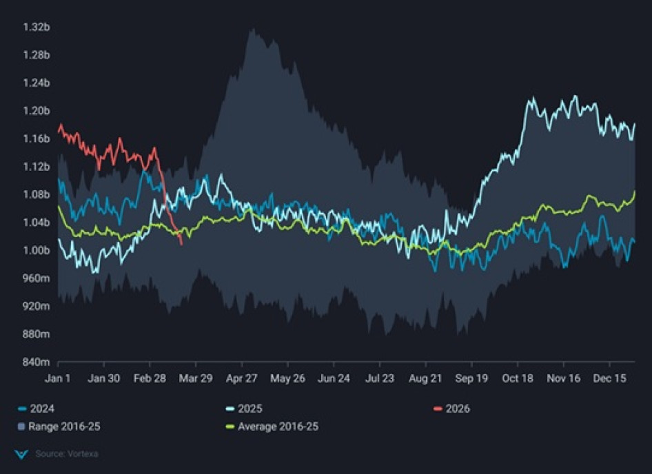 Még egy érdekes grafikon. A Vortexa olajkereskedelmi elemzőház felmérése azt mutatja, hogy mekkora a tengeren lévő kőolaj mennyisége – akár tranzitforgalomban, akár tengeri tárolás formájában.