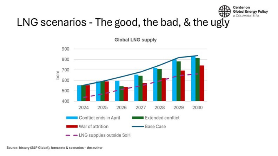 - Késleltetett tűzszünet. Ebben az esetben a Hormuzi-szoros csak idén ősszel indulhat meg, miután több ország együttes koalíciója legyőzi Iránt, vagy a rezsim összeomlik. Addig néhány hajó átmehet a Hormuzi-szoroson pénzért, de a valódi nyitás és az Arab-öbölben lévő eszközök csak ősztől állnak teljes biztonsággal rendelkezésre. Ebben az esetben az elemzők 50 milliárd köbméter LNG kínálat kiesésére számítanak 2026-ban, de 2027-ben már rendben nőhet a cseppfolyós export. A katari északi-mező bővítése 2028-ra csúszhat.