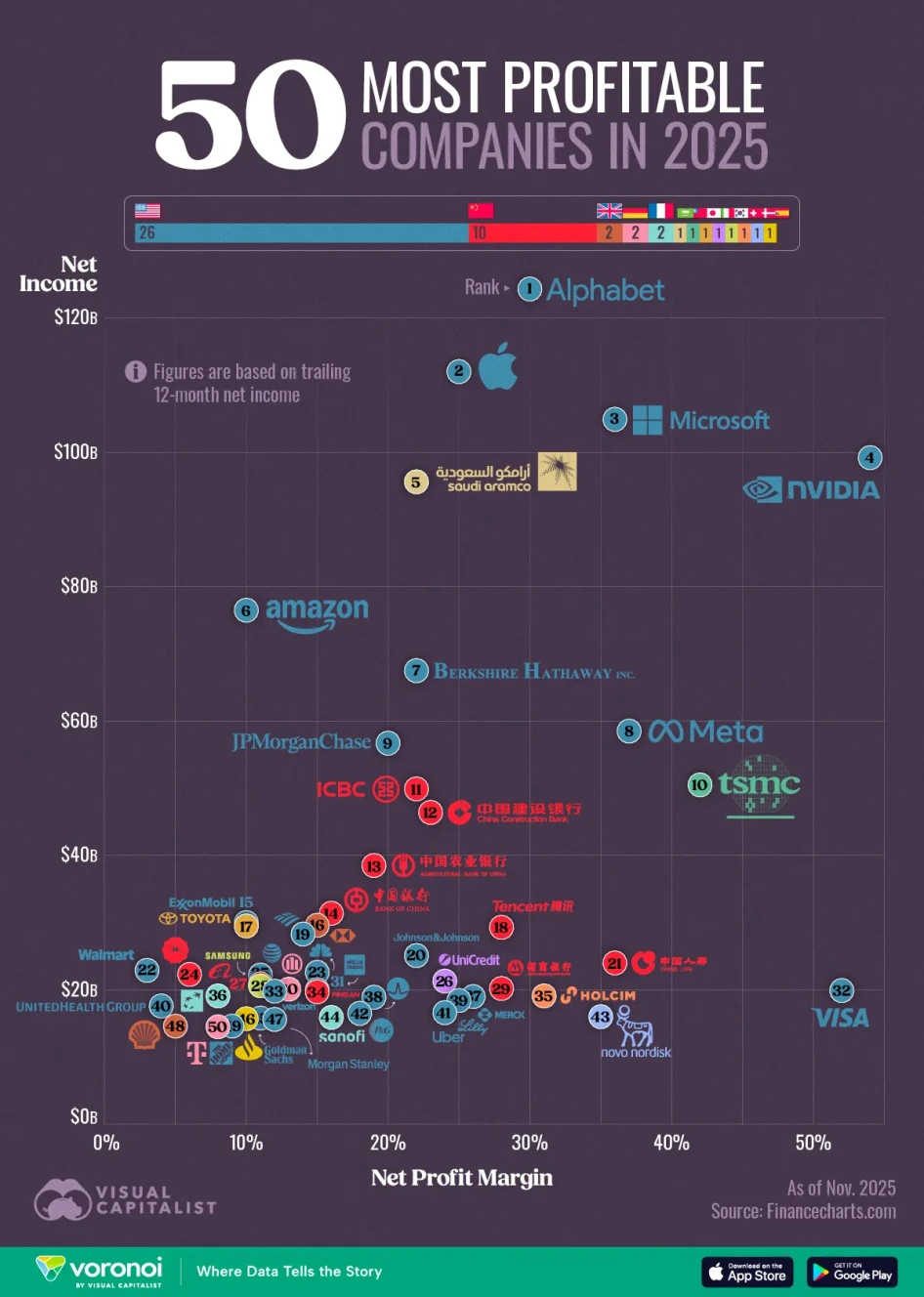 A Saudi Aramco a világ legjövedelmezőbb nem technológiai vállalata, amely a piaci volatilitás ellenére 95,6 milliárd dolláros energiatermelési bevételt termel. Az olyan gyógyszeripari vállalatok, mint a Merck, az Eli Lilly és a Novo Nordisk erős haszonkulcsokat mutatnak, amelyeket a nagy értékű terápiák és a kasszasiker gyógyszerfejlesztési folyamatok hajtanak.