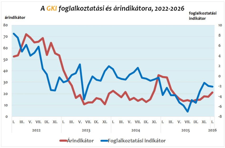A vállalkozások összesített létszámgazdálkodási várakozását jelző foglalkoztatási indikátor 2026 első hónapjában nem változott a tavaly decemberihez képest. A következő három hónapban a vállalkozások 9 százaléka készül a létszám bővítésére, míg 12 százaléka csökkentené azt. Az iparban és az üzleti szolgáltatások területén a létszám bővítésére törekvők vannak többségben az elbocsátásokra készülőkkel szemben. Az építőiparban viszont a leépítést tervezőké a többség.