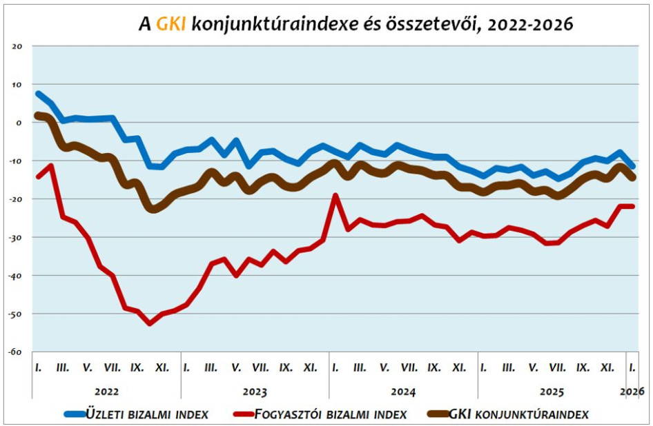 A GKI üzleti bizalmi indexe januárban csaknem 4 ponttal mérséklődött az előző hónaphoz képest. Így értéke lényegében visszatért a tavaly novemberi szintre. Az ipari bizalmi index számottevően, csaknem 5 ponttal, a kereskedelmi és a szolgáltatói index 3-3 ponttal csökkent. Ugyanakkor az építőipari mutató 3 ponttal emelkedett – igaz, meglehetősen alacsony szintről. A közeljövő kilátásait illetően továbbra is az építőipar a legkevésbé, az üzleti szolgáltatások pedig a leginkább derűlátó szektor.