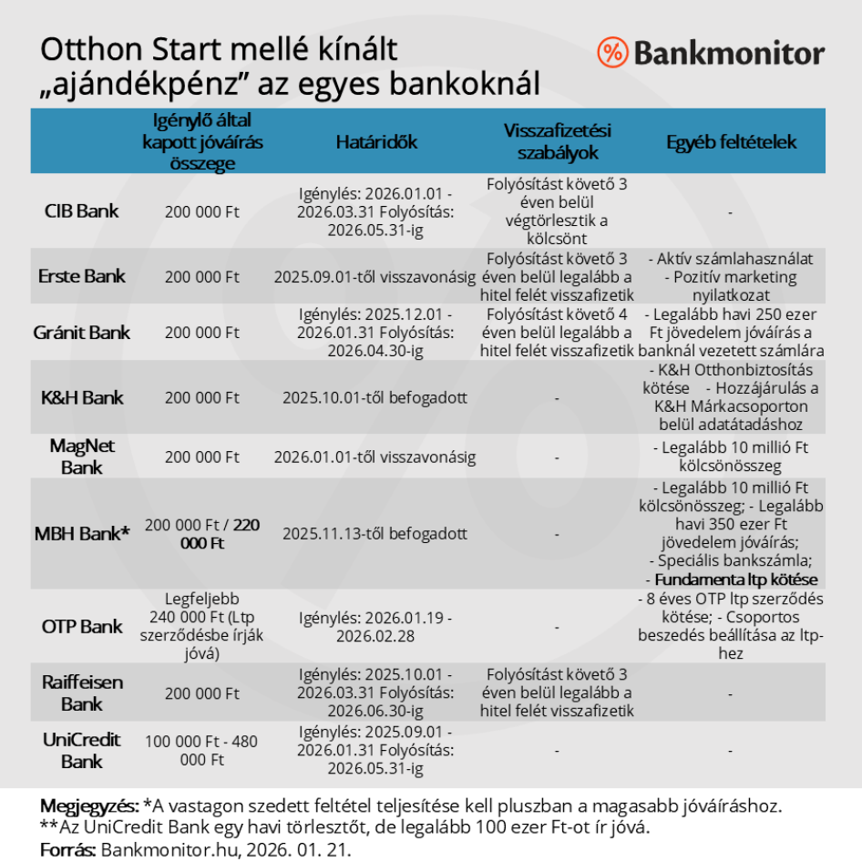 Az Otthon Start berobbanását követően egyre több bank kínált külön jóváírást – azaz ajándékpénzt – a verseny odáig fokozódott, hogy már minden bank ajánlata között szerepel legalább 200 ezer forint jóváírás valamilyen formában – hívja fel a figyelmet a Bankmonitor.