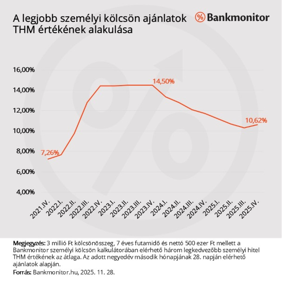 2021 végén a Bankmonitor személyihitel-kalkulátorában szereplő 3 legkedvezőbb ajánlat átlagos thm értéke 7,26 százalék volt. 2023 végén volt a mélypont, akkor ugyanezen kölcsönre a legkedvezőbb ajánlatok átlagos thm értéke már 14,50 százalék volt. Jelenleg egy hasonló hitelt már 10,62 százalékos thm-érték mellett is fel lehet venni.