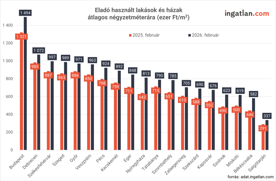 A vármegyeszékhelyek piacain is bőség jellemző, az érintett városokban összességében 36 százalékkal nőtt a használt lakóingatlanok kínálata, ám az árakban továbbra is jelentős az eltérés. A legtöbb hirdetéssel Pécsen rendelkezik: közel 2200 használt lakás érhető el 924 ezer forintos medián négyzetméteráron. Debrecenben majdnem 1700 eladó használt lakóingatlan szerepel a kínálatban, itt az árak már elérik az 1,07 millió forintot. Szeged és Győr fej-fej mellett halad: előbbi városban 1574 használt lakás keresi gazdáját 989 ezer forintos, utóbbiban 1190 ingatlan 971 ezer forintos négyzetméteráron. Székesfehérváron 588 használt eladó lakás mellett 997 ezer forintos árszint az irányadó, míg Kecskeméten 670 használt ingatlan érhető el 892 ezer forintos medián négyzetméteráron. Miskolcon a több mint 1000 darabos használtlakás-kínálathoz mellett 619 ezer forintos érték társult. A legolcsóbb vármegyeszékhely továbbra is Salgótarján négyzetméterenként átlagosan 339 ezer forinttal, ami a legdrágábbnak számító debreceni lakásárszint kevesebb mint harmadát teszi ki.