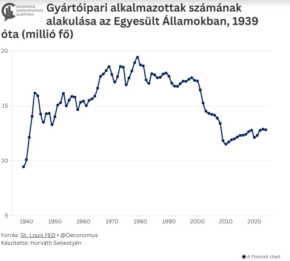 A Trump-kormányzat vámpolitikájának célrendszere sokrétű, legfőbb célként azonban az Egyesült Államok újraiparosítását lehet kiemelni. Ezzel Trump amellett, hogy biztosítani akarja a stratégiai iparágakban a megfelelő kapacitású gyárak meglétét, még magas hozzáadott értékű feldolgozóipari munkahelyeket is akar létrehozni, ezzel felemelve az 1950-es évek óta elnéptelenedő és leszakadó rozsdaövezeteket. Az alábbi ábrán szembetűnő, hogy az elmúlt másfél évtizedben annak ellenére alacsonyabb az Egyesült Államokban a gyártóiparban foglalkoztatottak száma, mint az 1940-es években, hogy azóta több mint 100 millió fővel nőtt az ország lakossága. Ez részben köszönhető az USA gazdaságának szerkezeti átalakulásával, – az úgynevezett szekunder ipari szektor visszaszorult a szolgáltatási ágazat (tercier szektor) javára – de a termelőkapacitások délkelet-ázsiai országokba és Mexikóba való kiszervezése is igen jelentősen hozzájárult a korábban ipari központnak számító régiók hanyatlásához.