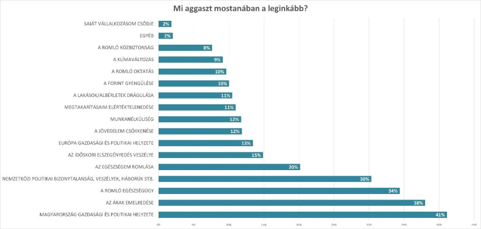 A leginkább aggodalomra okot adó faktorok tekintetében jelentős változások következtek be a tavalyi felmérés eredményeihez képest. A korábbi nagy mumus, az infláció visszaszorult a második helyre, miközben a hazánk gazdasági és politikai helyzetével kapcsolatos aggodalmak a harmadikról az első helyre kerültek.