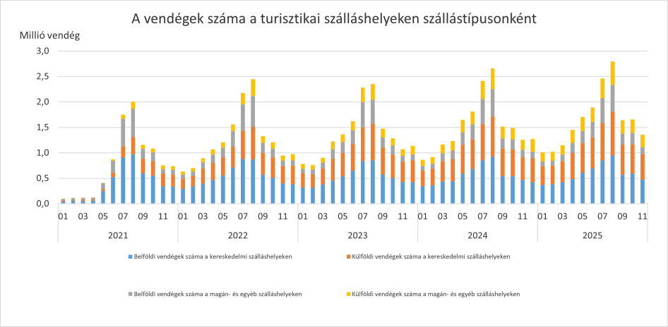 • A külföldi vendégek száma 15, az általuk eltöltött vendégéjszakáké 12 százalékkal emelkedett az előző év azonos hónapjához viszonyítva. A szezonálisan kiigazított adatok alapján a külföldi vendégek száma 13, az általuk eltöltött vendégéjszakáké 9,5 százalékkal nőtt 2024 novemberéhez képest. A turisztikai szálláshelyekre érkezett 744 ezer külföldi vendég közel 1,8 millió vendégéjszakát töltött el, közülük 502 ezer vendéget és 1,2 millió vendégéjszakát a kereskedelmi szálláshelyeken regisztráltak. Az utóbbi vendégek 88 százalékát a szállodák fogadták, ahol a számuk 11 százalékkal nagyobb volt az egy évvel korábbinál. A magán- és egyéb szálláshelyek külföldi vendégeinek száma 22 százalékkal meghaladta a 2024. novemberit. A külföldi vendégek száma az előző év azonos hónapjához viszonyítva mindegyik turisztikai térségben nőtt, a legnagyobb mértékben a Budapest környéke és a Mátra–Bükk térségben (28, illetve 21 százalékkal). Budapesten 17, a Balatonnál 14 százalékkal nagyobb volt a turisztikai szálláshelyekre érkezett külföldi vendégek száma.