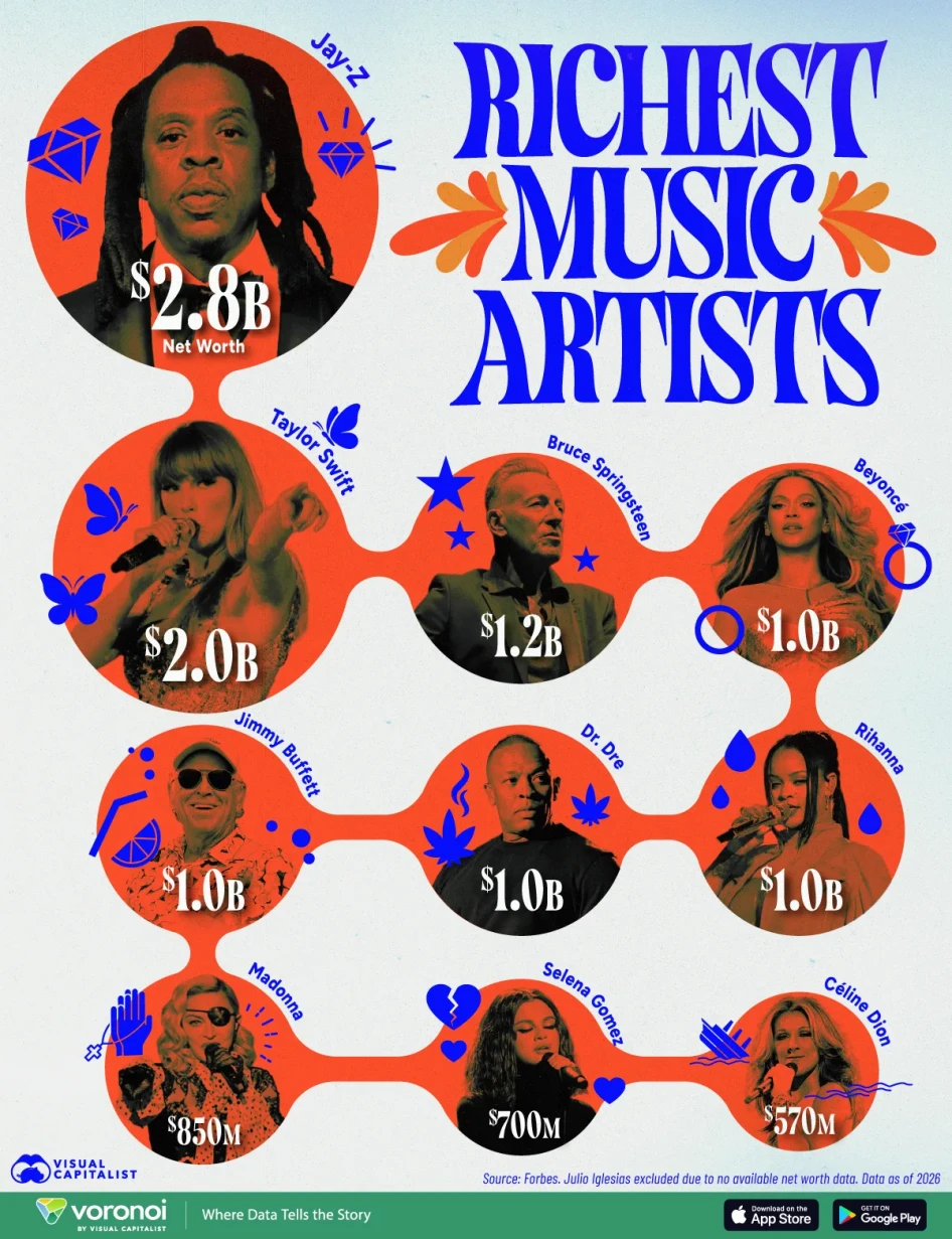 Több milliárd dolláros nettó vagyonát részben a jogdíjakból és turnékból származó több mint 800 millió dollár, egy 12 albumból álló, 600 millió dolláros zenei katalógus és több mint 110 millió dolláros ingatlanvagyon adja.