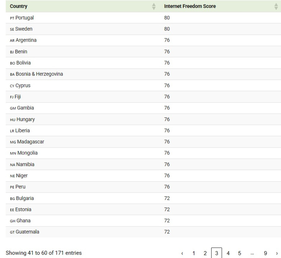 Az európai országok birtokolják az internetszabadság legfelső helyeinek több mint a felét, és különösen az északi országok, Svédország (80) az egyetlen kivétel. Az északi országok szellemisége liberális, kormányaik és társadalmaik jellemzően toleránsak.
