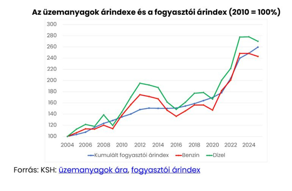 2010 óta az üzemanyagok literenkénti ára a fogyasztói árindexnél valamivel alacsonyabb mértékben növekedett. Mivel egy autó működési költségének java részét az üzemanyagra fordított pénz teszi ki, az üzemanyagok áralakulása fontos tényező az autótulajdonosok anyagi helyzetének változása szempontjából. Ehhez első lépésben azt érdemes megvizsgálni, hogy a többi fogyasztási cikkhez képest hogyan változott az üzemanyagok ára. A GKI szerint míg a benzin árindexe 2025-ben 76 százalékkal volt magasabb 2010-hez képest, a dízel ára pedig 88 százalékkal emelkedett, addig az infláció kumuláltan 93 százalékot tett ki.