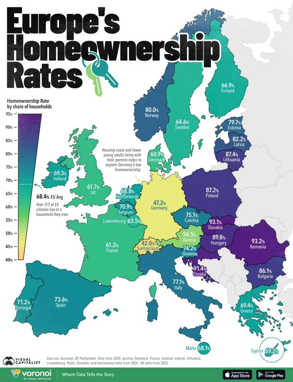 Svájcban, a világ egyik leggazdagabb országában, a háztartásoknak mindössze 42 százaléka birtokolja azt az otthonát, amelyben él. Németországban hasonlóképpen a háztartások kevesebb mint fele minősül tulajdonos-lakónak (47,2 százalék), míg a szomszédos Ausztriában ez az arány csak kissé magasabb, 54,5 százalék.