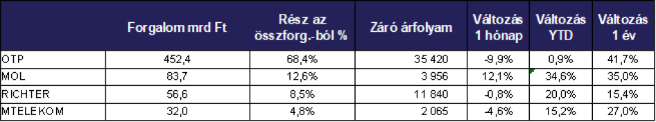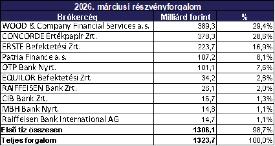 A befektetési szolgáltatók versenyében a WOOD & Company diadalmaskodott, 389,3 milliárd forintos forgalmának köszönhetően. A Concorde 378,3 milliárd forintos forgalma a második helyre volt elegendő, míg az ERSTE 223,7 milliárd forint értékű forgalmat bonyolított, ezzel a dobogó harmadik fokára állhatott fel.