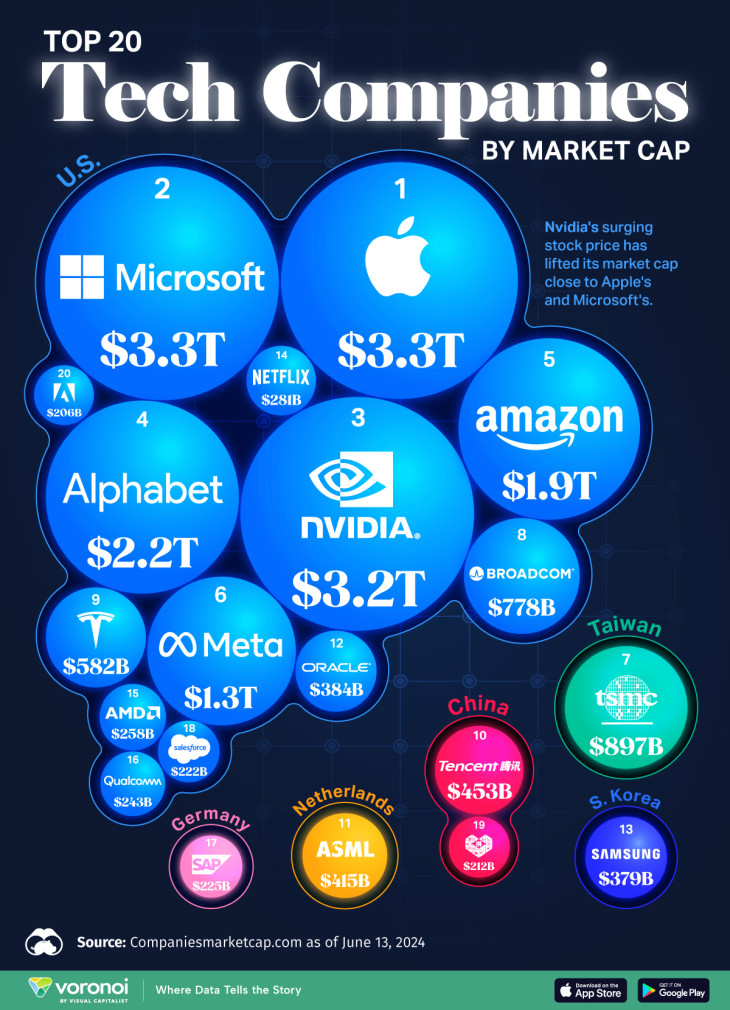 A Companiesmarketcap.com adatai szerint az Apple jelenleg a legnagyobb technológiai vállalat, amely hosszú évek óta versenyez a Microsofttal a lista élén. A vállalat piaci tőkéje megugrott, miután bejelentette generatív mesterséges intelligenciáját, az Apple Intelligence-t. Az elemzők úgy vélik, hogy az emberek a következő néhány évben frissíteni fogják eszközeiket, mivel az új funkciók csak az iPhone 15 Pro vagy újabb készülékeken érhetők el.