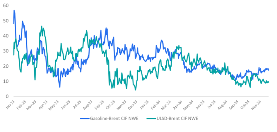 A nyugat-európai benzin és a dízel árrések a Brenthez képest (USD/bbl)
