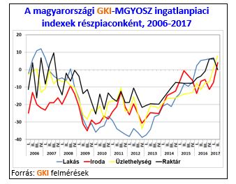 2017 elején a GKI irodapiaci indexeinek értéke a fővárosra vonatkozóan 1, az ország egészére vonatkozóan csaknem 3 ponttal növekedett. Éves összevetésben az előbbi esetében 5, az utóbbiban 6 pontos emelkedés volt regisztrálható. Mindkét esetre igaz, hogy bár a közelmúltban a jelenleginél magasabb értékeket mértünk, a jelenlegi kilátások egyáltalán nem borúlátók, sőt.