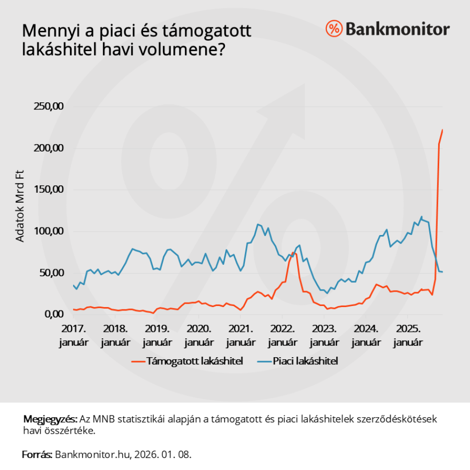 Piaci kamatozású lakáshitelekre az Otthon Start bejelentése előtt 2025 első félévében havonta átlagosan 107,66 milliárd forint összegben kötöttek szerződést. Novemberre ez az összeg 51,36 milliárd forintra csökkent. Vagyis kevesebb, mint a felére esett vissza a piaci hitelek kihelyezése.
