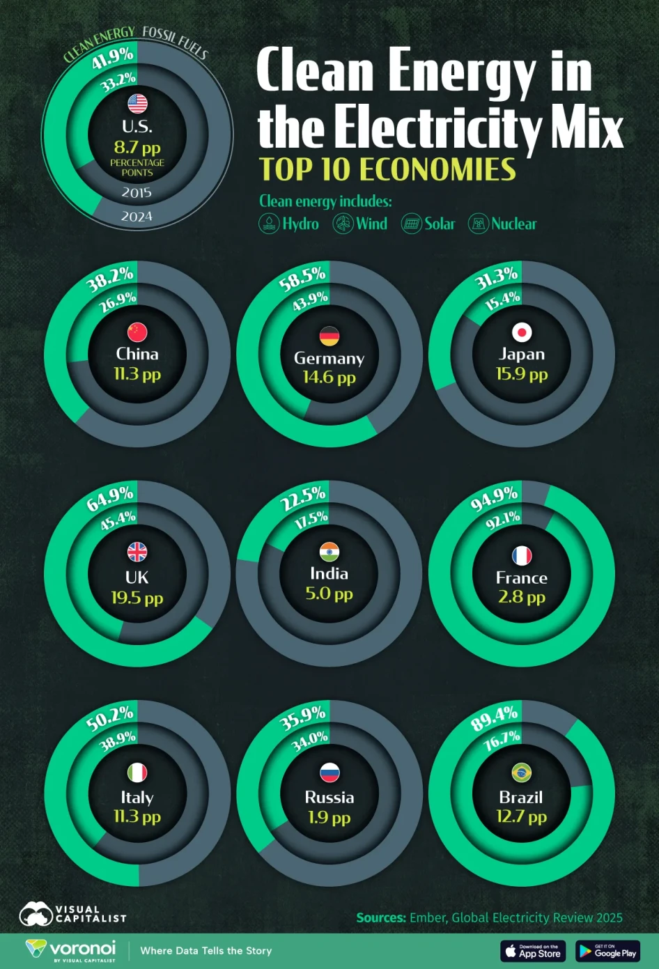 Az Egyesült Államok a mezőny közepén helyezkedik el, folyamatos, de kevésbé drámai növekedéssel. A szél- és napenergia növekedése növelte a tiszta villamos energia részesedését, de a földgáztól való folyamatos függés lelassította az átmenet általános ütemét az európai versenytársakhoz képest.