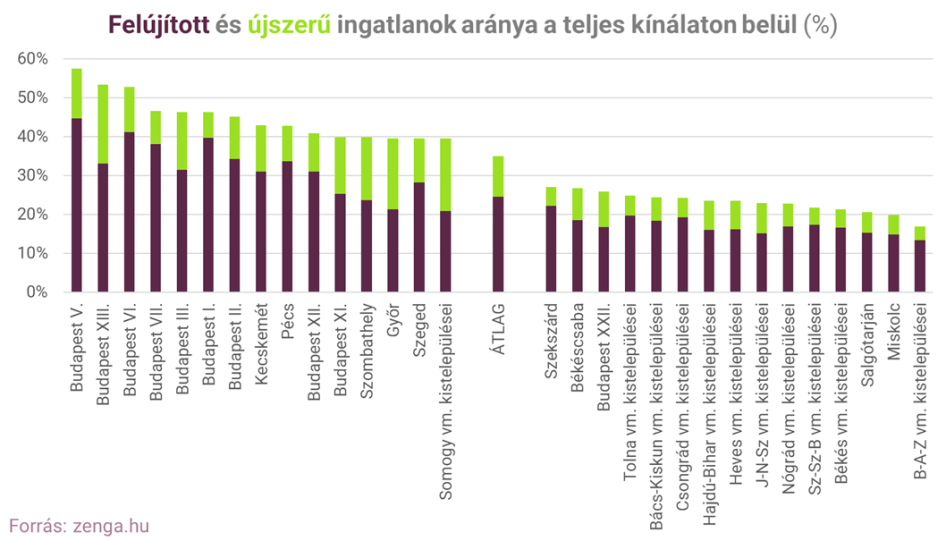 A zenga.hu kínálatában szereplő eladó ingatlanok közül a legjobb állapotú – felújított és újszerű – lakóingatlanok Budapesten és néhány nagyobb városunkban vannak átlag feletti arányban. A fővárosban a belső kerületekben a rövid távú lakáskiadás, valamint az utóbbi időben épült lakóparkok is hozzájárultak a jó állapotú lakások magasabb arányához.