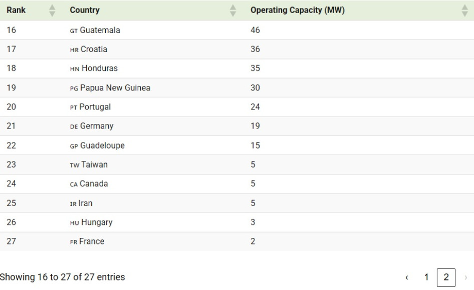 Az Egyesült Államok dominálja a geotermikus termelést 3734 megawatt kapacitással, 1300 megawattal megelőzve a következő legnagyobb termelőt.