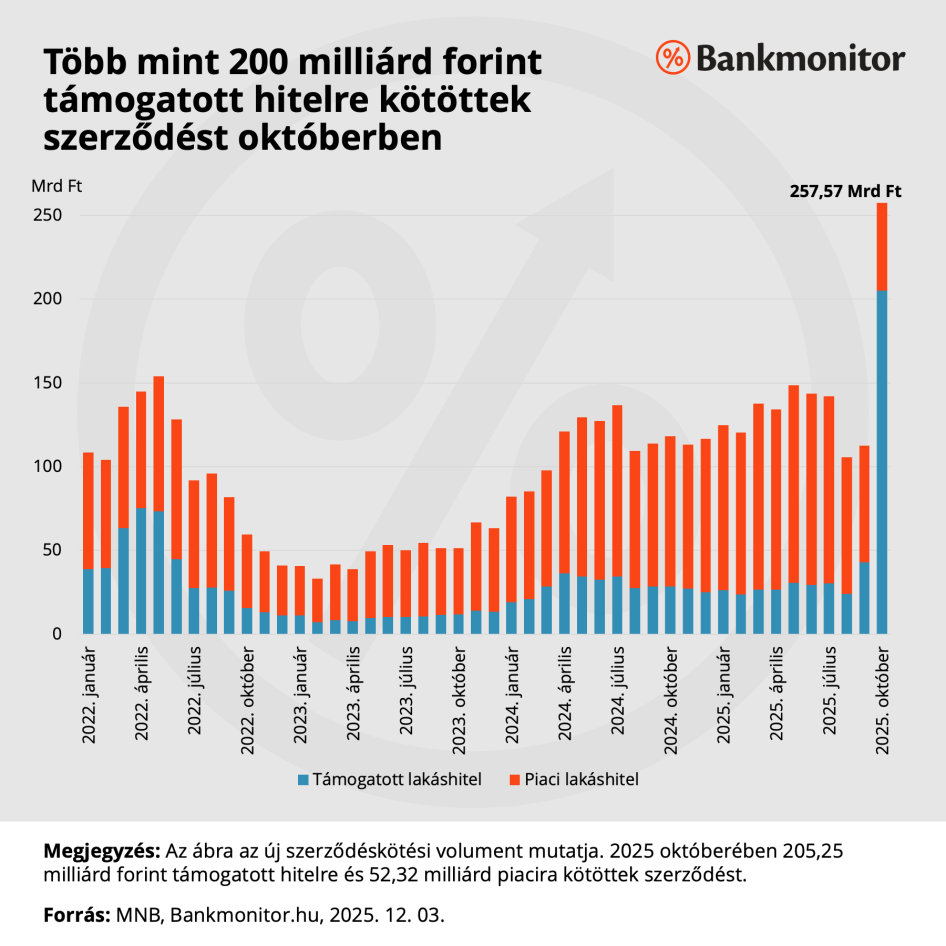 A lakáshiteleken belül októberben a támogatott kölcsönök aránya meghaladta a 79 százalékot, gyakorlatilag csak minden ötödik hiteligénylő vett fel piaci kamatozású kölcsönt.