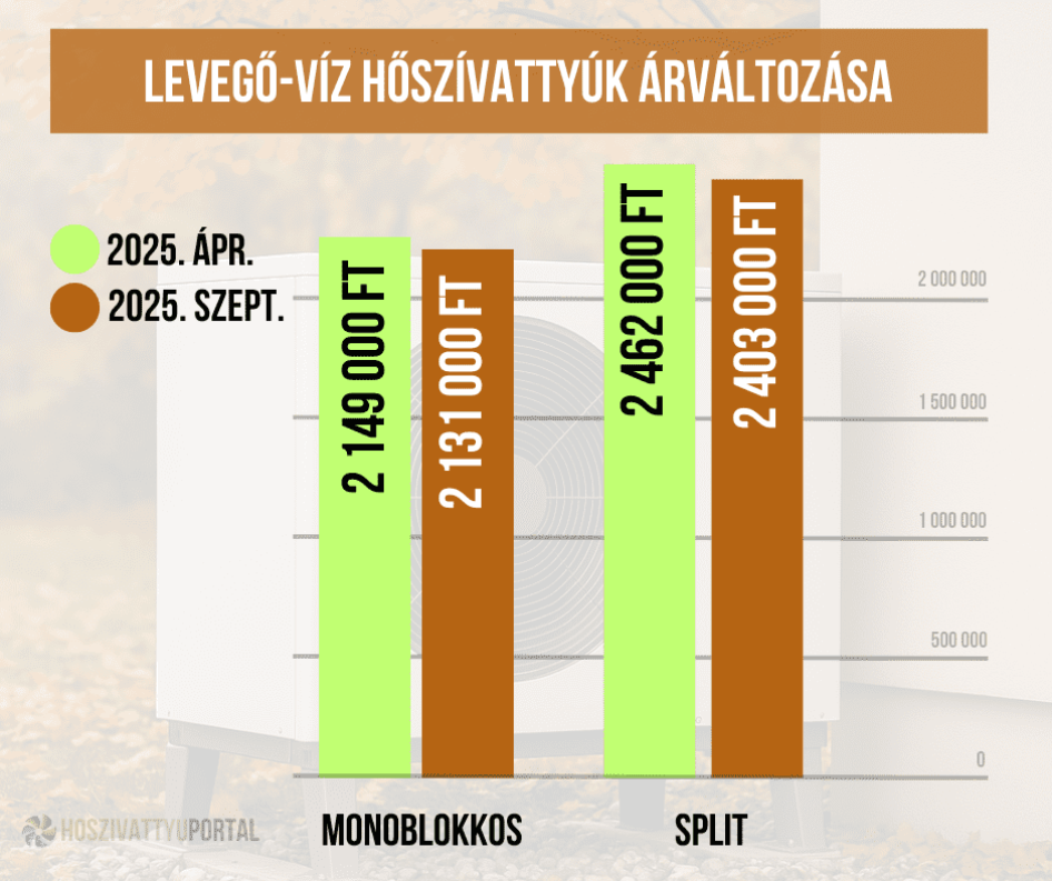 A Hőszivattyú Portál által végzett árfigyelés szerint 2025 áprilisa és szeptembere között az árak átlagosan 1,9 százalékkal csökkentek. Bár az árak döntő többsége változatlan maradt, a vizsgált készülékek 22 százalékának csökkent az ára, és csupán 4 százalékuk került többe, mint tavasszal.