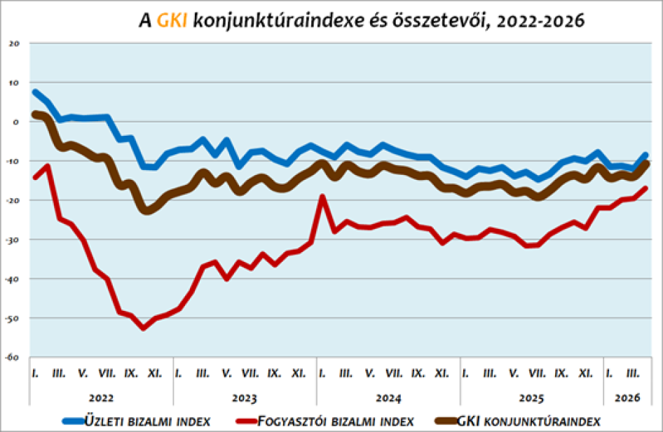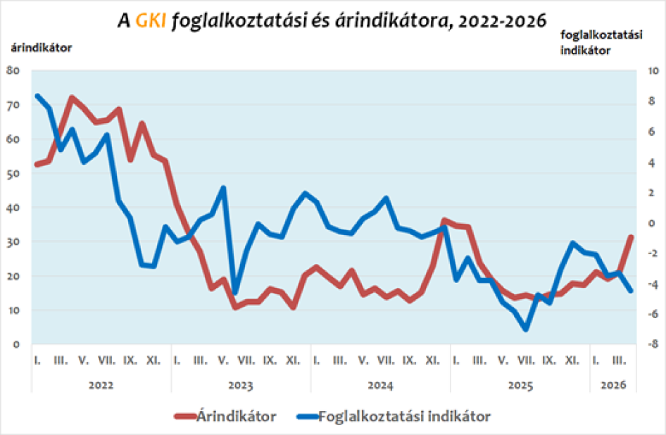 A vállalkozások összesített létszámgazdálkodási várakozását jelző foglalkoztatási indikátor 2026 negyedik hónapjában kissé csökkent márciushoz képest. A következő három hónapban a vállalkozások 8 százaléka készül a létszám bővítésére, míg 11 százaléka csökkentené azt. Az építőiparban és a kereskedelemben a létszám csökkentésére törekvők vannak többségben a bővítést tervezőkkel szemben, az iparban ez a két arány gyakorlatilag megegyezik, míg a szolgáltatások területén az utóbbiaké a többség.