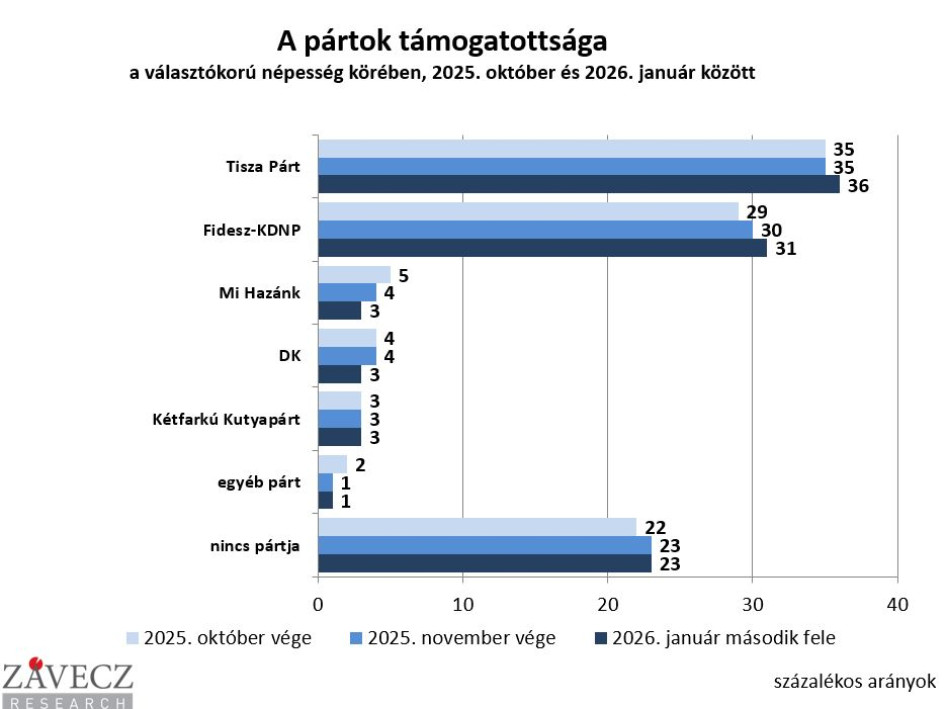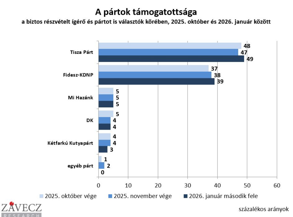 A biztos elmenetelt ígérők és pártot is választók csoportjában a Tisza Párt 49 százalékos, a Fidesznek 39 százaléka van. A Mi Hazánk az előző parlamenti választások óta egyszer sem került a bejutási küszöb alá, most is eléri az 5 százalékot. Ebben az aktív választói körben a DK 4 százalékon, a Kétfarkú Kutyapárt 3 százalékon áll - ezek a legérdekesebb eredményei a ZRI Závecz Research Intézet január második felében végzett közvélemény-kutatásának. A felmérés 1000 fős mintán készült az ország felnőtt népességét reprezentáló mintán, ún. hibrid adatfelvételi módszerrel, telefonos és online kérdezés együttes alkalmazásával.