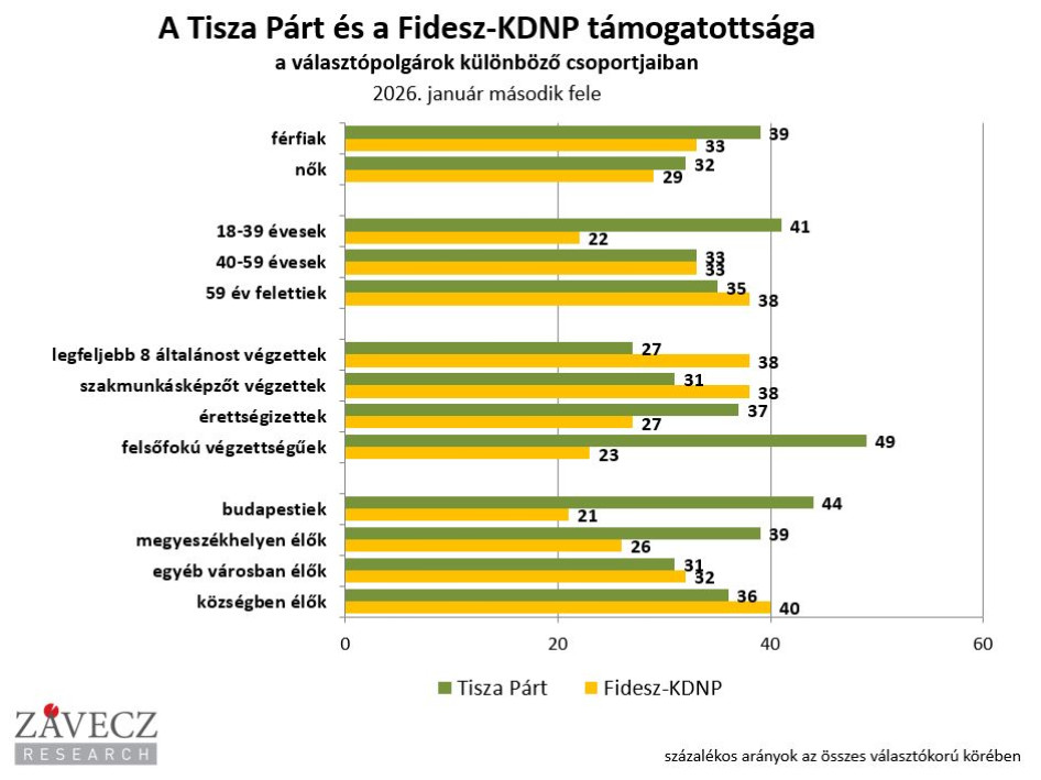 A 40 év alattiak csoportjában fölényesen vezet a Tisza Párt, 41 százalék-os a tábora, a kormánypárté 22 százalék. A negyvenes-ötvenes korosztályban teljesen azonos a táboruk mérete: 33-33 százalék-os. A 60 év felettiek körében a Fidesz-KDNP előzi a Tiszát: 38, illetve 35 százalékot érnek el.
