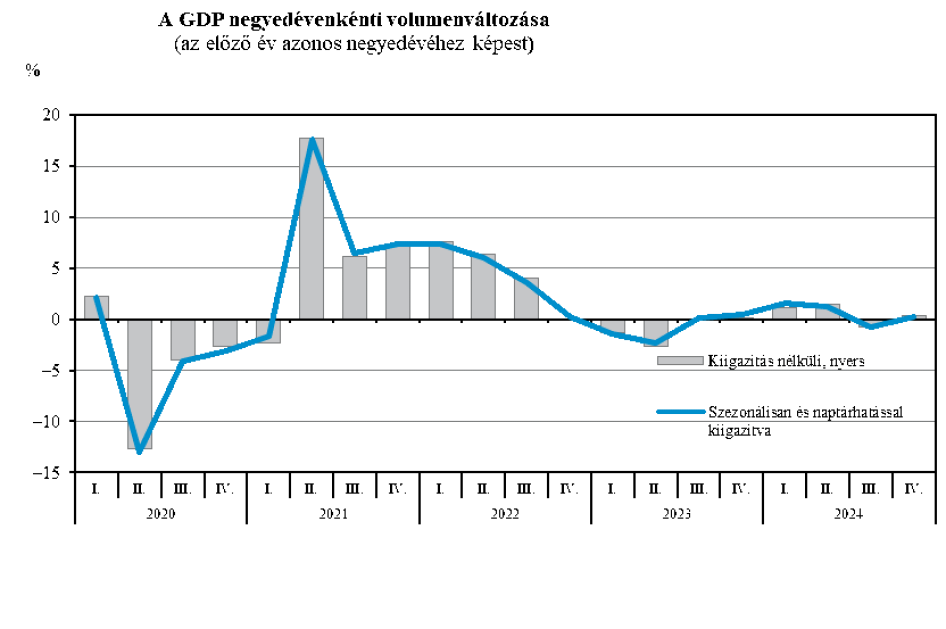 A KSH adatai szerint az előző negyedévhez képest – a szezonálisan és naptárhatással kiigazított és kiegyensúlyozott adatok szerint – a gazdaság teljesítménye 0,5 százalékkal bővült, véget ért a technikai recesszió. 2024-ben a gazdaság teljesítménye a nyers adatok szerint 0,5, a szezonálisan és naptárhatással kiigazított és kiegyensúlyozott adatok szerint 0,6 százalékkal meghaladta az előző évit.