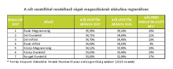 A női munkavállalók fizetése átlagosan 16 százalékkal marad el férfi kollégáikétól, de régiónként is eltérő különbségekkel kell számolnunk. A legmagasabb – közel 20 százalékos – eltéréssel a Közép-Dunántúlon és Közép-Magyarországon találkozhatunk, míg a legalacsonyabb – átlagosan 8 százalékos – különbséget az észak-alföldi megyékben mérték. A női vezetők aránya Észak-Magyarországon a legmagasabb, itt a cégek 35,35 százalékánál találkozhatunk nővel a felsővezetésben. A Nyugat-Dunántúlon a legrosszabb a helyzet, ahol mindössze 33 százalékot tesz ki a női vezetővel működő cégek aránya, ami minimális növekedést jelent 2016-hoz képest. A legnagyobb – negyed százalékpont közeli – növekedést a Dél-Alföldön és Közép-Magyarországon mértük.