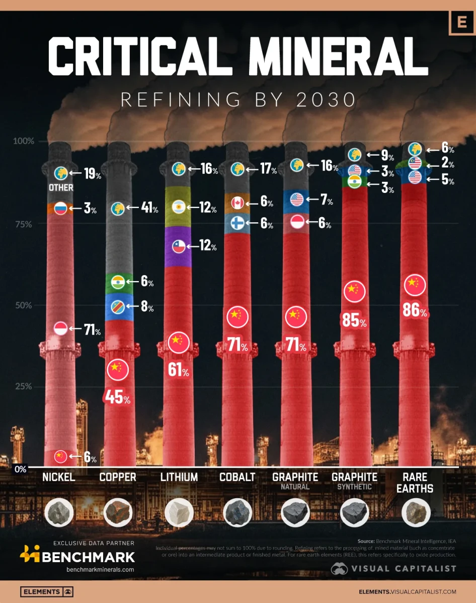 Kína várhatóan a legnagyobb (60 százalékos) részesedéssel rendelkezik majd a globális finomított kritikus ásványianyag-ellátásban 2030-ra. A nikkel az egyetlen ásvány, amely felett egy másik ország, Indonézia (71 százalék) várhatóan nagyobb piaci részesedéssel rendelkezik, mint Kína (6 százalék).