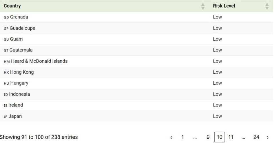 Összesen 90 ország került az alacsony kockázatú kategóriába, 57 ország pedig a magas kockázatú zónába, míg a többi a közepes és érzékeny kockázatú kategóriákba esik.