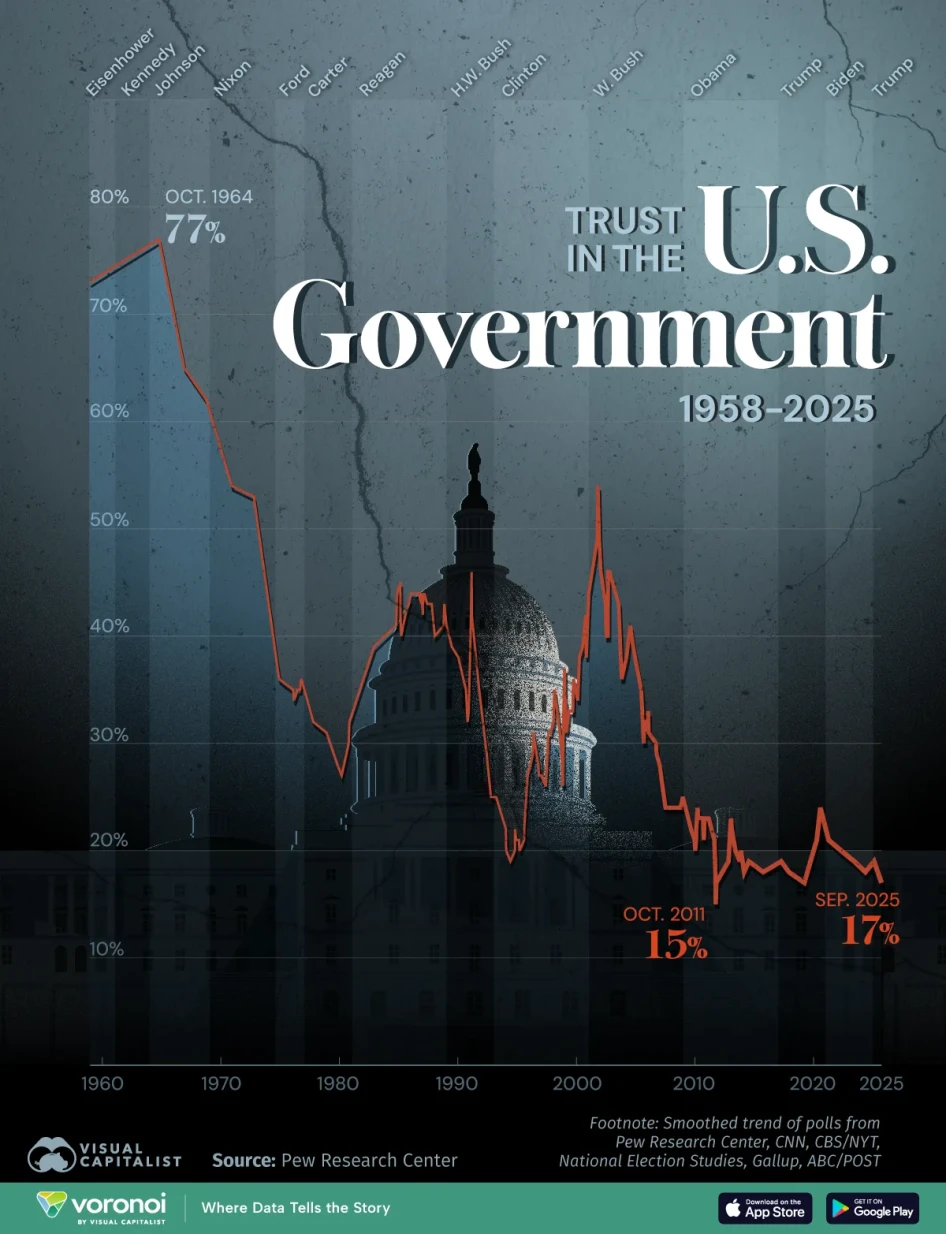 2025 szeptemberében az amerikaiak mindössze 17 százaléka mondta azt, hogy az idő nagy részében bízik a szövetségi kormányban – ez közel van a Pew idősoraiban feljegyzett legalacsonyabb szinthez.