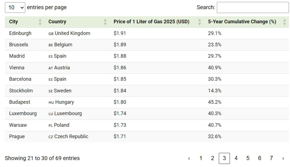 Ezzel szemben az amerikai üzemanyagárak viszonylag alacsonyak maradtak a jelentős olajtermelésnek köszönhetően. San Francisco az ország legdrágább városa, ahol az árak öt év alatt literenként 0,97 dollárról 1,30 dollárra emelkedtek. New Yorkban is folyamatos emelkedés tapasztalható, a 2020-as 0,70 dollárról 2025-re 0,94 dollárra emelkedett az üzemanyag ára.