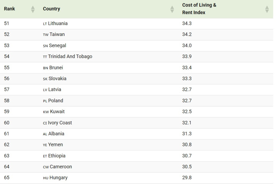 A spektrum másik végén Pakisztán (11,3), Líbia (11,3) és Afganisztán (11,6). Ezekben az országokban a világ legalacsonyabb megélhetési költségeivel élhetnek az emberek.